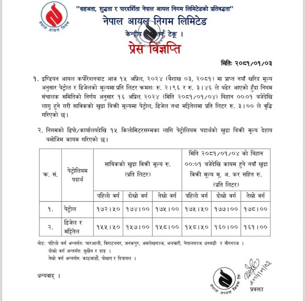 निगमका अनुसार अब काठमाडौं उपत्यकामा पेट्रोलको मूल्य १७८ रुपैयाँ प्रतिलिटर पर्नेछ भने डिजेल र मट्टितेल १६१ रुपैयाँ पर्नेछ । बढेको मुल्य आजै राति १२ बजेदेखि लागू हुने छ ।