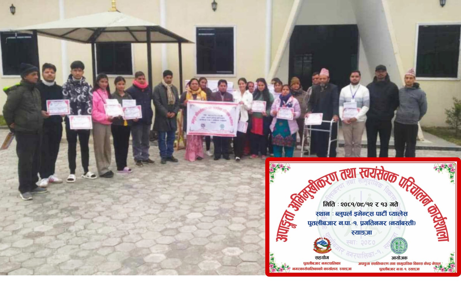 कार्यक्रम बाट सामाजिक भाव भएका एवं स्वयम् सेवकको रुपमा कार्य गर्न इच्छुक १२ जना बिधार्थीहरु छनौट गरिएकाे छ। छनौट भएका स्वयंसेवकहरु, संस्थाका पदाधिकारी सदस्यहरू र अपाङ्गता अगुवा गरी २५ जना को लागि अपाङ्गता अभिमुखीकरण तथा स्वयंसेवक परिचालन कार्यशाला गत पौष १२ र १३ गते सम्पन्न भएको थियाे ।