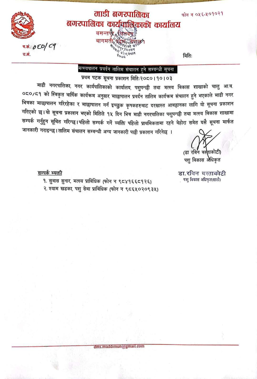 माछापालन सम्बन्धी तालिम संचालन हुने सम्बन्धी सूचना